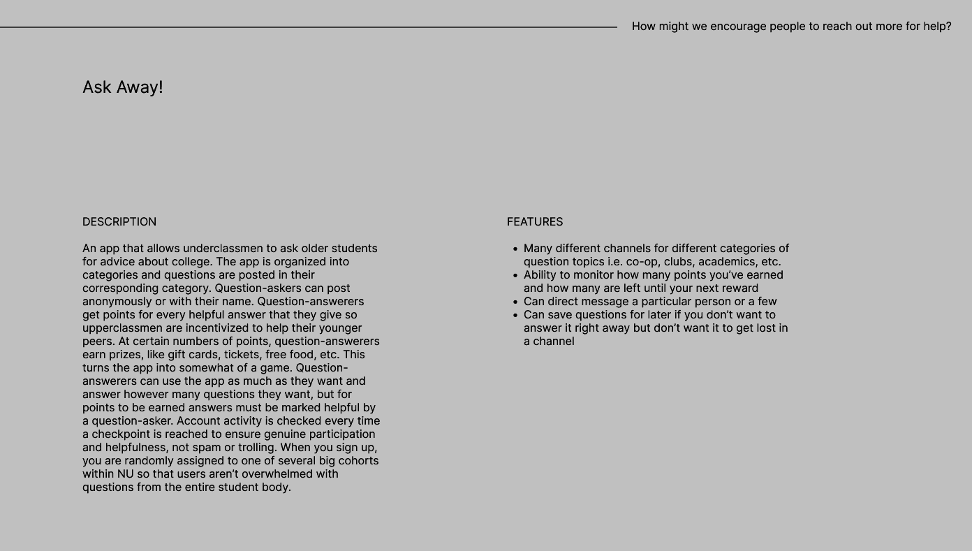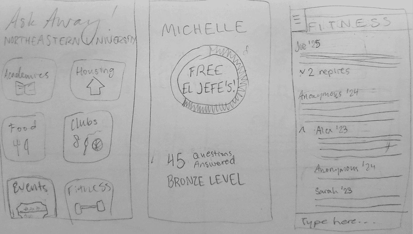 This is a prototype of a forum app for Northeastern underclassmen. It serves as a space for newer students to talk to upperclassmen and reliably get all of their NU-related questions answered in one place. Ask Away! incentivizes upperclassmen to answer questions by letting them earn prizes, like free food, for certain quantities of helpful answers. The main goal of creating this app was to learn how to iterate using user research and feedback to create an intuitive app flow for a real, specific target audience at Northeastern.
