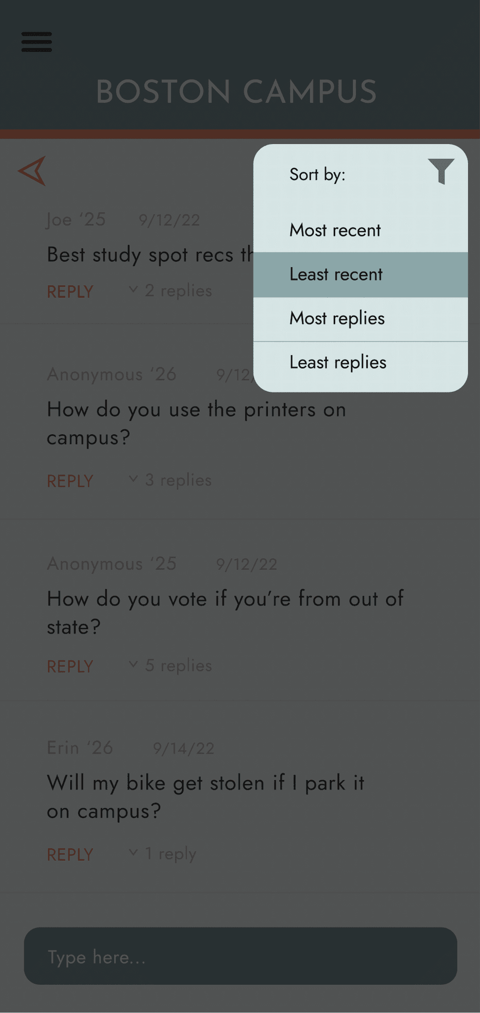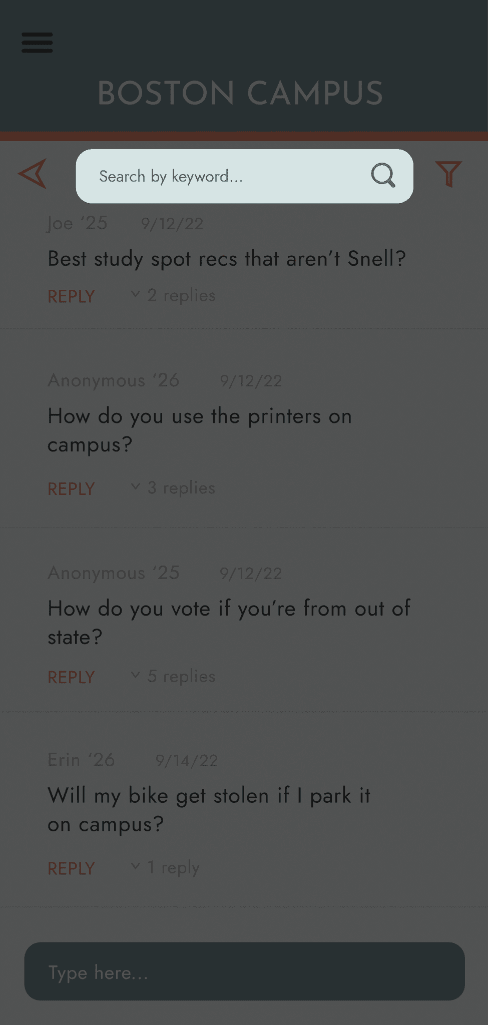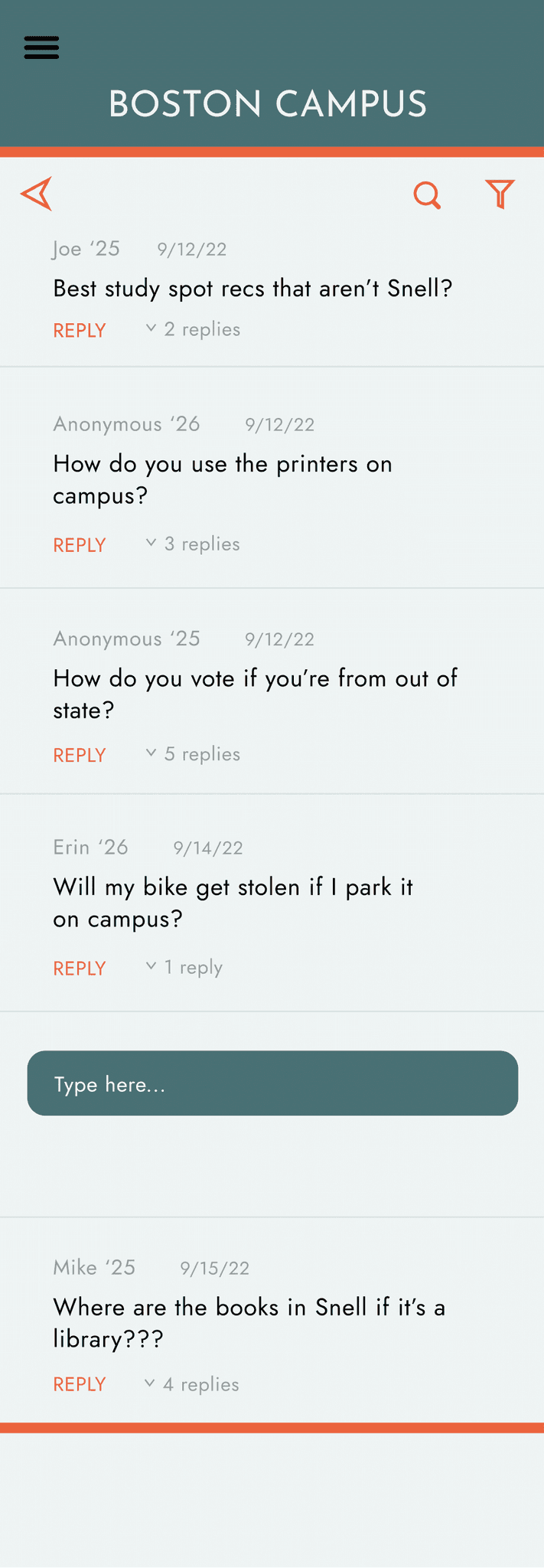 Hierarchy of text in the forum: made replies more transparent, the reply a bright orange call to action, name of the user smaller than their message, and date sent even smaller than that
