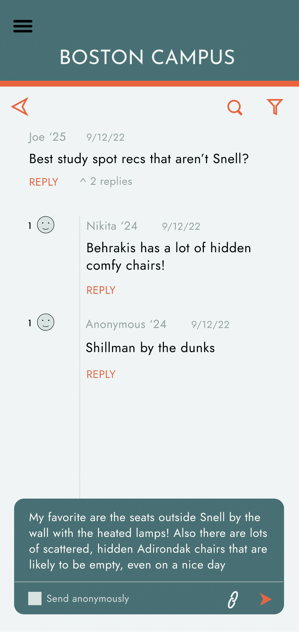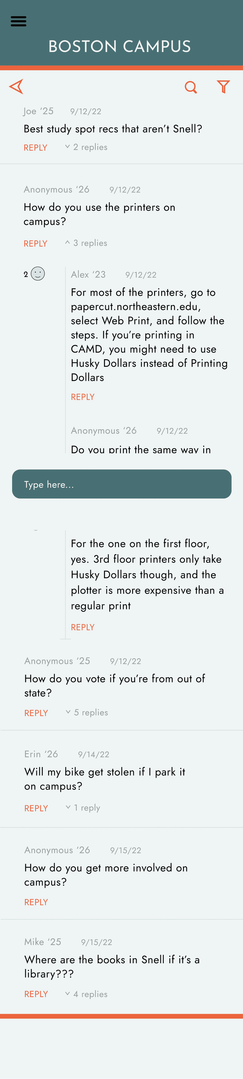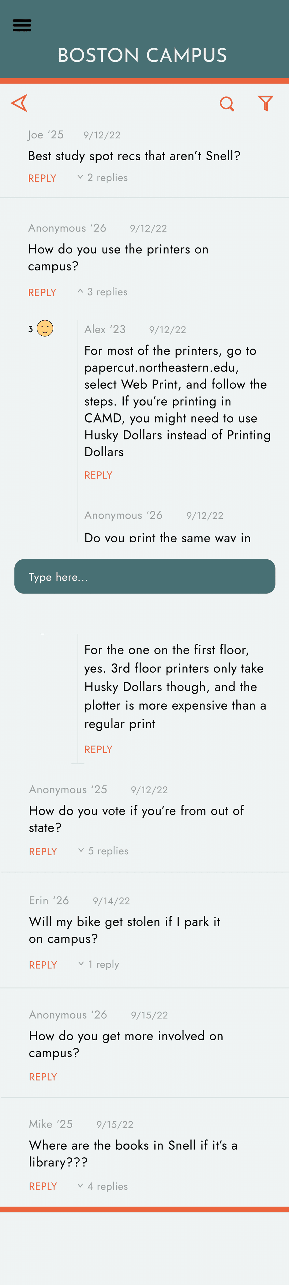 Hierarchy of text in the forum: made replies more transparent, the reply a bright orange call to action, name of the user smaller than their message, and date sent even smaller than that