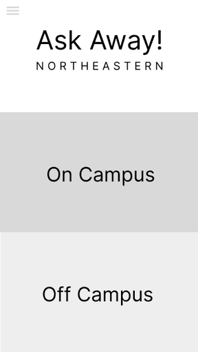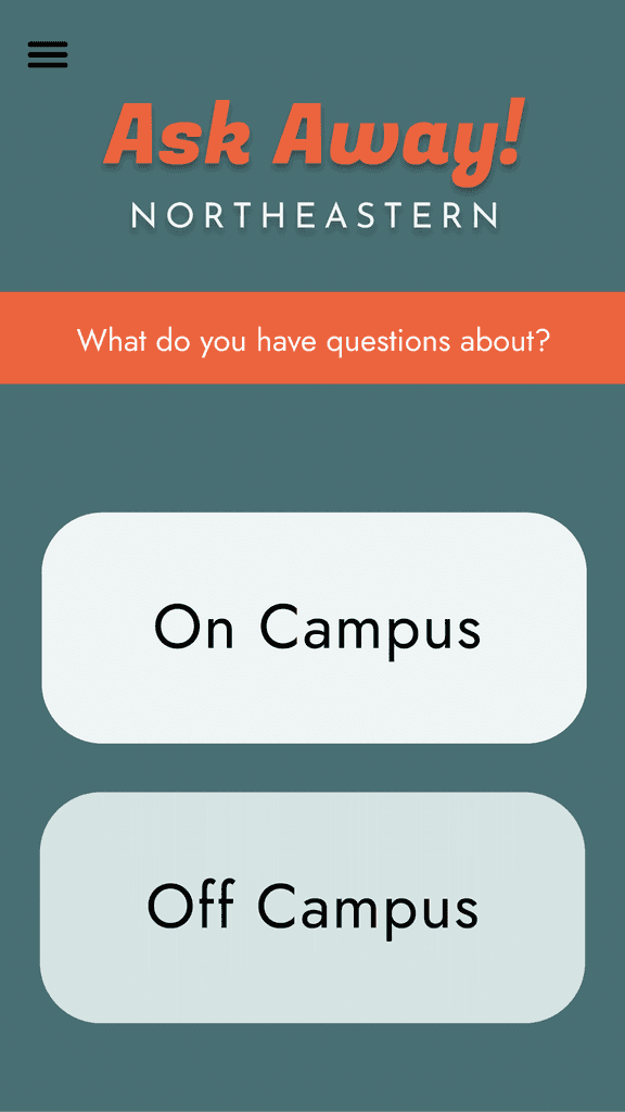 The decisions that I made regarding the categories themselves also influenced the design of the app. I made several iterations of the home screen where the user was presented with the categories, and I ended up choosing the layout that started off with just two options (on campus or off campus questions) followed by a more detailed breakdown, so as not to overwhelm the user with too many choices right at the start.