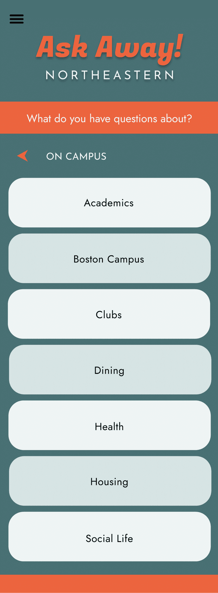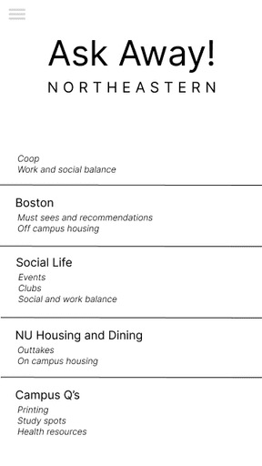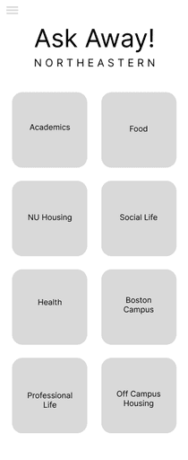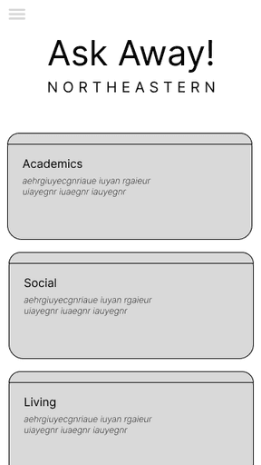 One of my main challenges was organizing the app's many questions into intuitive categories. To do so, I compiled a list of 50 of the most commonly asked NU-related questions via interviews and various social media. Then, I asked three different people to sort the questions into however many categories they felt was appropriate and name each one accordingly. Using that information, I created the final categories that would be used on the app.