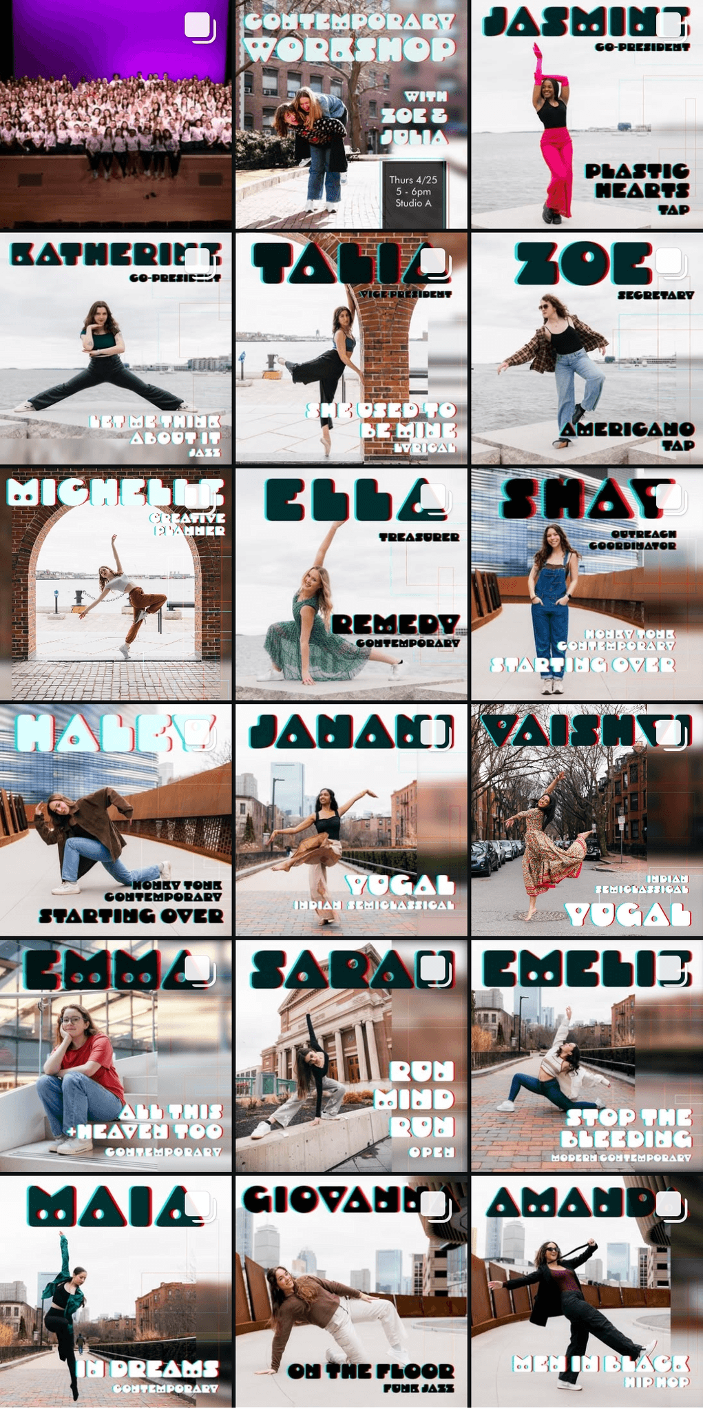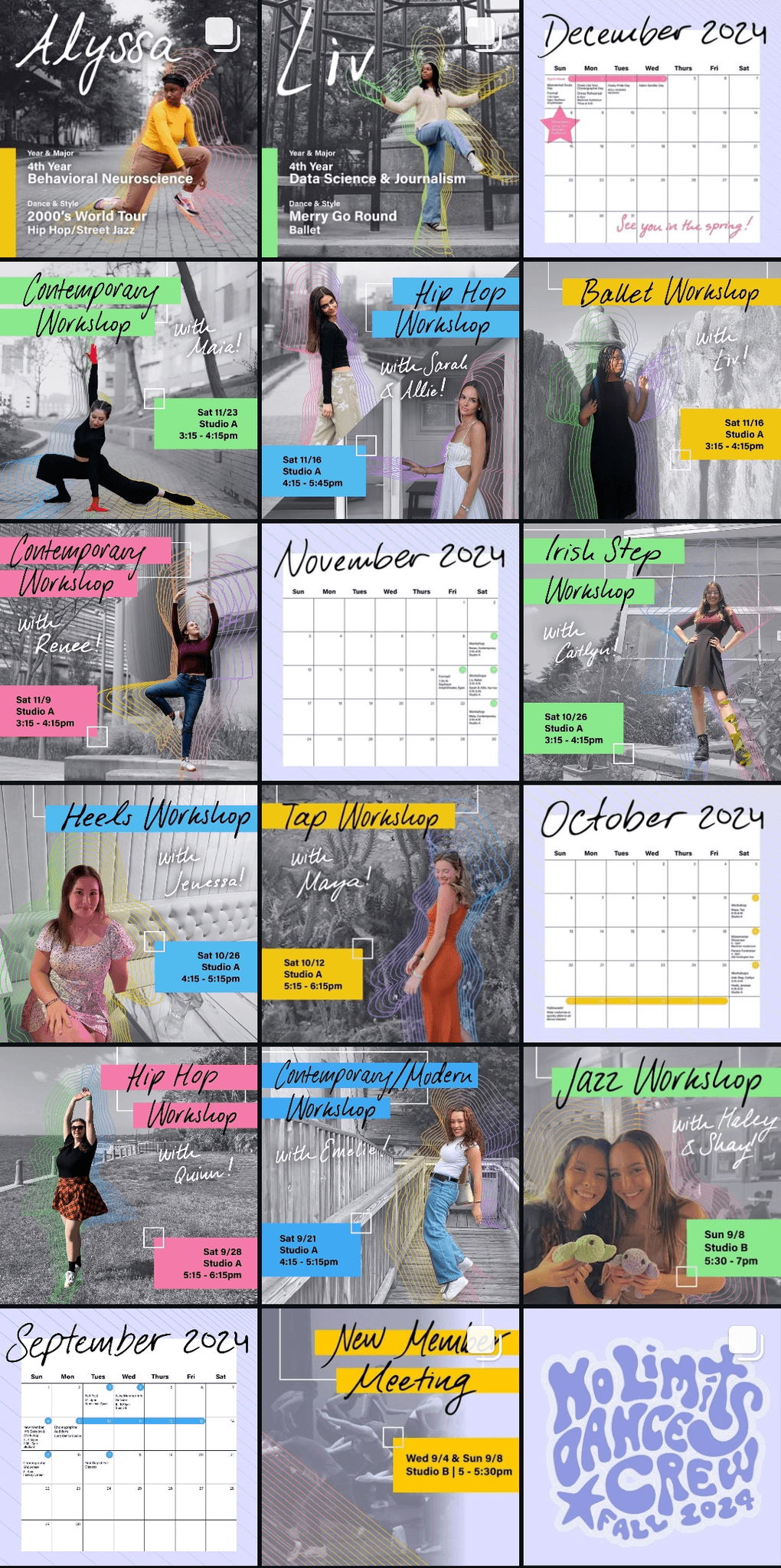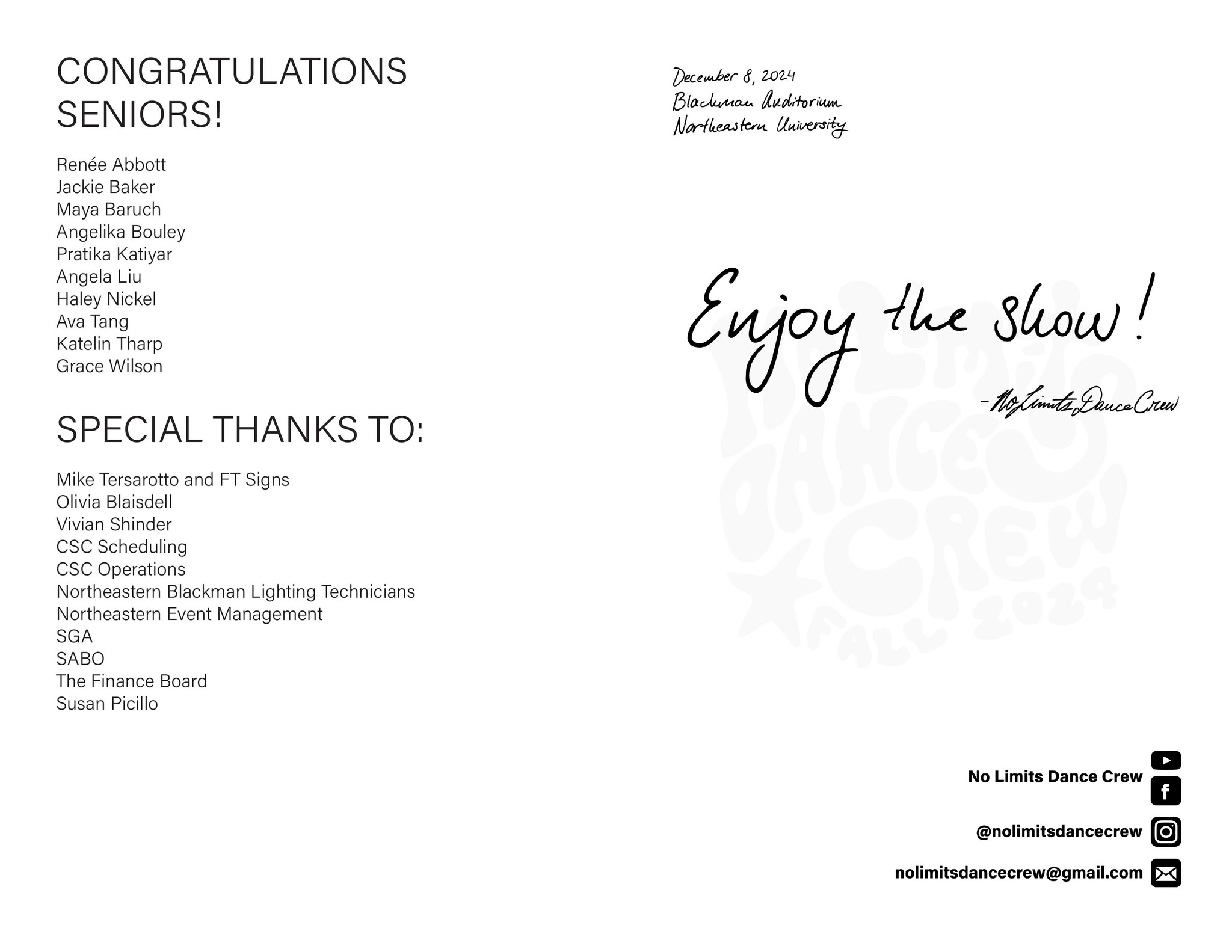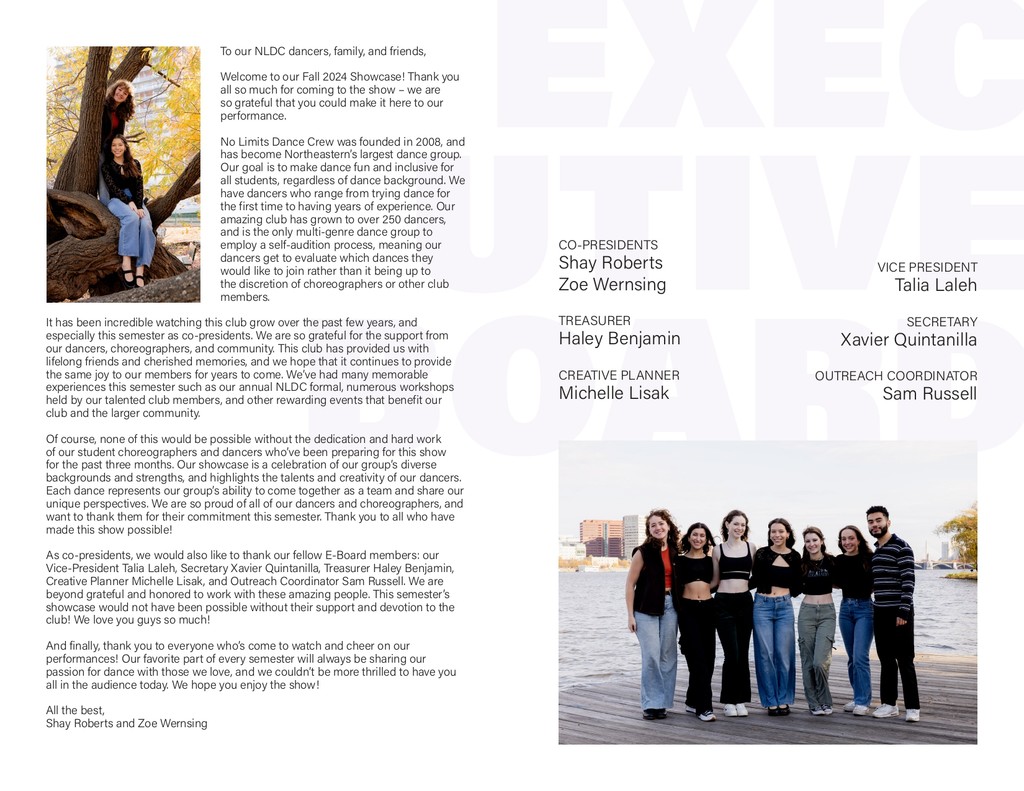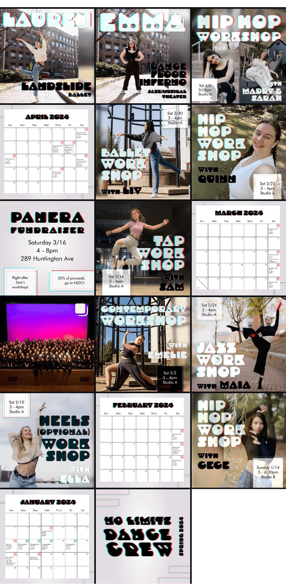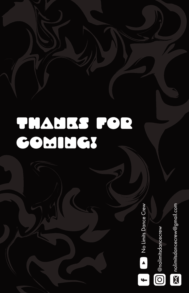 I created all creative materials for Northeastern University's dance club, No Limits Dance Crew, including merchandise, show programs, social media posts, YouTube video thumbnails, and more. Each semester had a different theme tying all designed elements together.